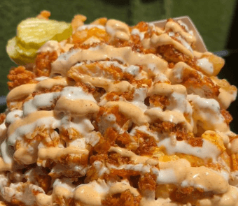 Breaded, deep-fried potatoes filled with a creamy mixture of melted cheese. Served with a side of ranch sauce.